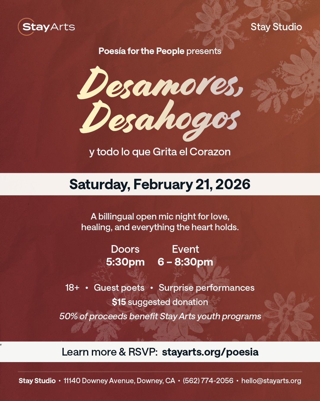 Poesía for the People welcomes our comunidad to share their Desamores, Desahogos, y todo lo que Grita el Corazón on Saturday, February 21 @ 5:30pm – a bilingual open mic night for love, healing and everything the heart holds.