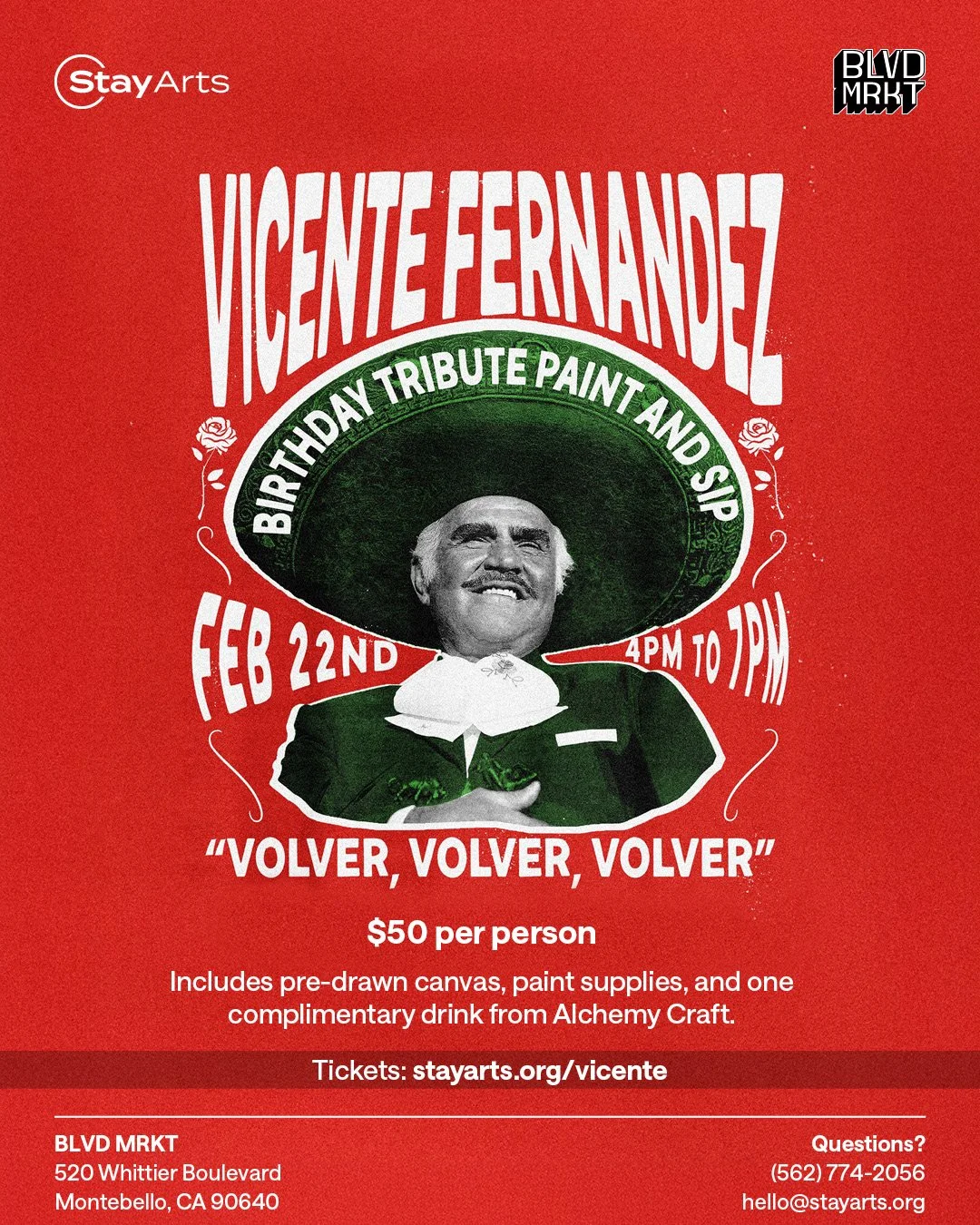 Join us for a special Paint & Sip in honor of Vicente Fernández’s birthday, hosted by Stay Arts at Alchemy Craft. You’ll create a custom painting while surrounded by the sound of his iconic music, great company, and amazing drinks and bites from the restaurants at BLVD MRKT. Our professional teaching artists will be on hand to offer tips and support 🎨