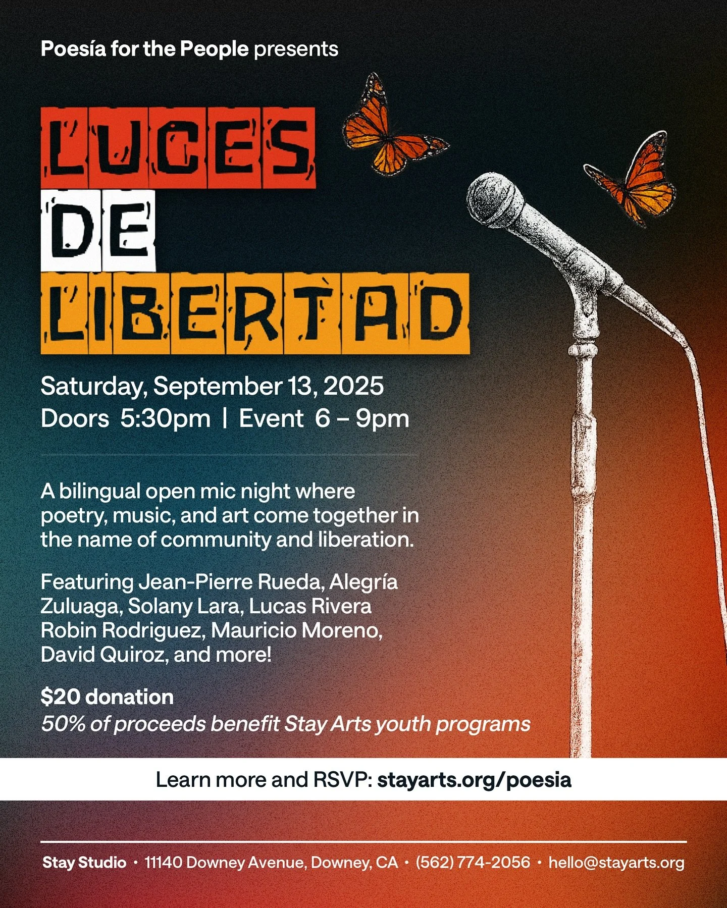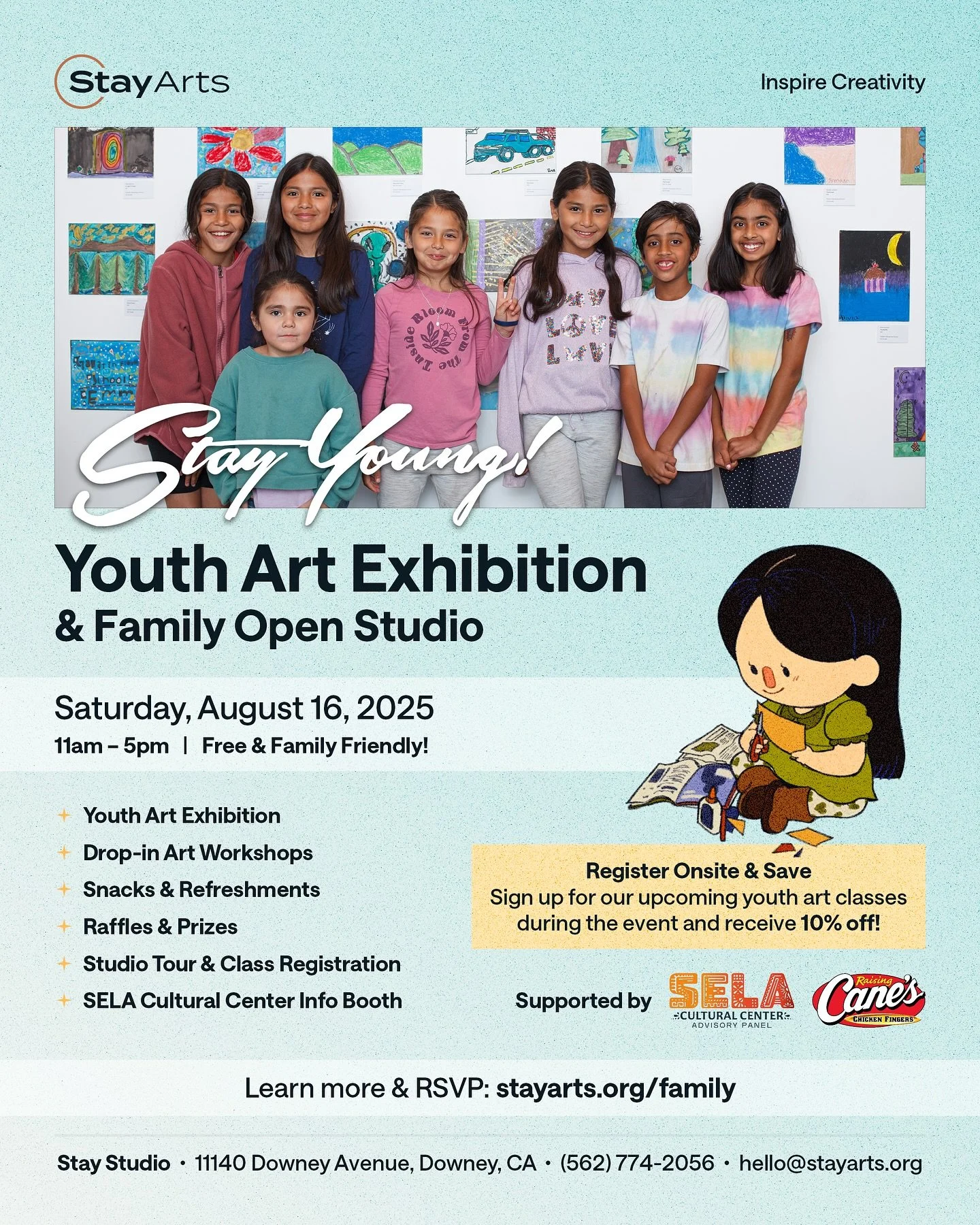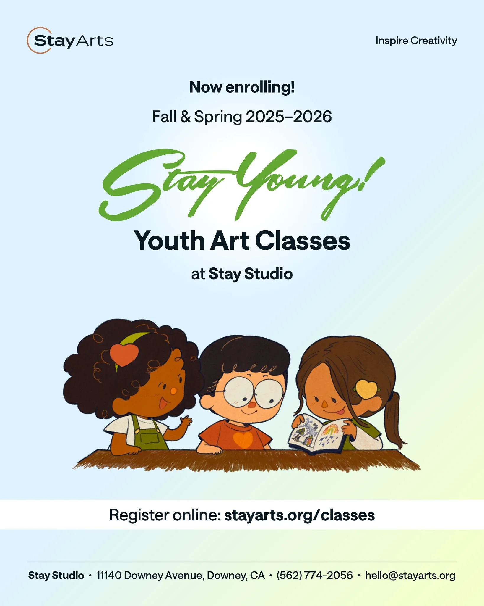 Stay Studio is a creative space in Downtown Downey operated by Stay Arts. We host weekly art classes for youth and adults, public programs like Paint & Sip and Family Paint Day, and select exhibitions and workshops throughout the year. The studio is a welcoming place for hands-on learning, artistic exploration, and meaningful community connection. Since 2012, it has been a cultural anchor in Southeast LA and a creative home for artists, students, and families alike.